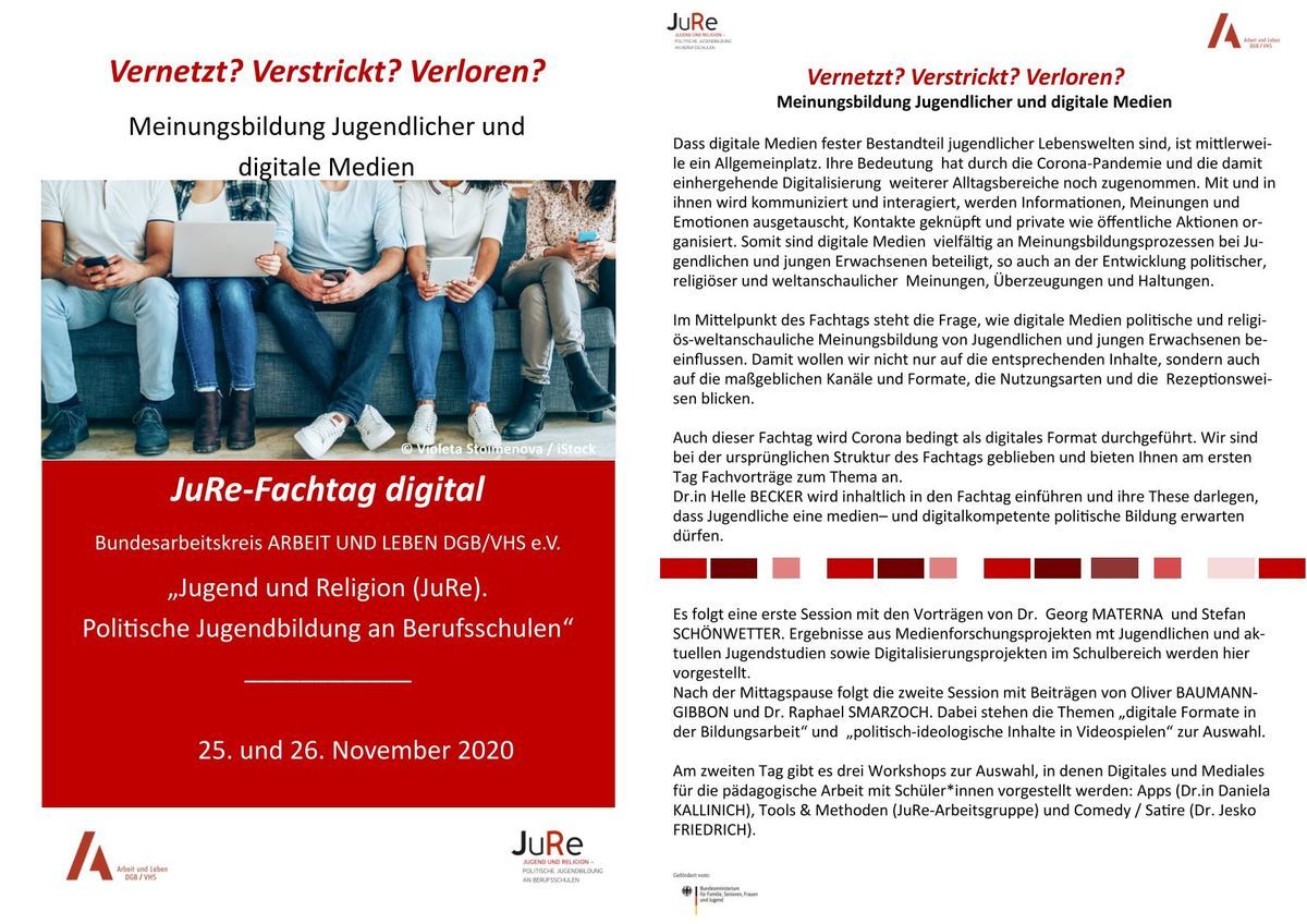 Liebe Kolleg*innen, warum in die Ferne schweifen… und nicht mal eine Hausveranstaltung besuchen?! Das JuRe-Team lädt Euch herzlich zu unserem digitalen Fachtag „Vernetzt? Verstrickt? Verloren? Meinungsbildung Jugendlicher und digitale Medien“ am 2…
