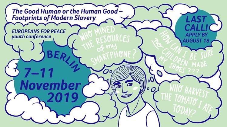 the 2nd EUROPEANS FOR PEACE youth conference will be under the claim The Good Human or the Human Good – Footprints of Modern Slavery. After last years‘ theme „Right here, right now: Human rights“ we want to gain a deeper insight on Article 4 of the…