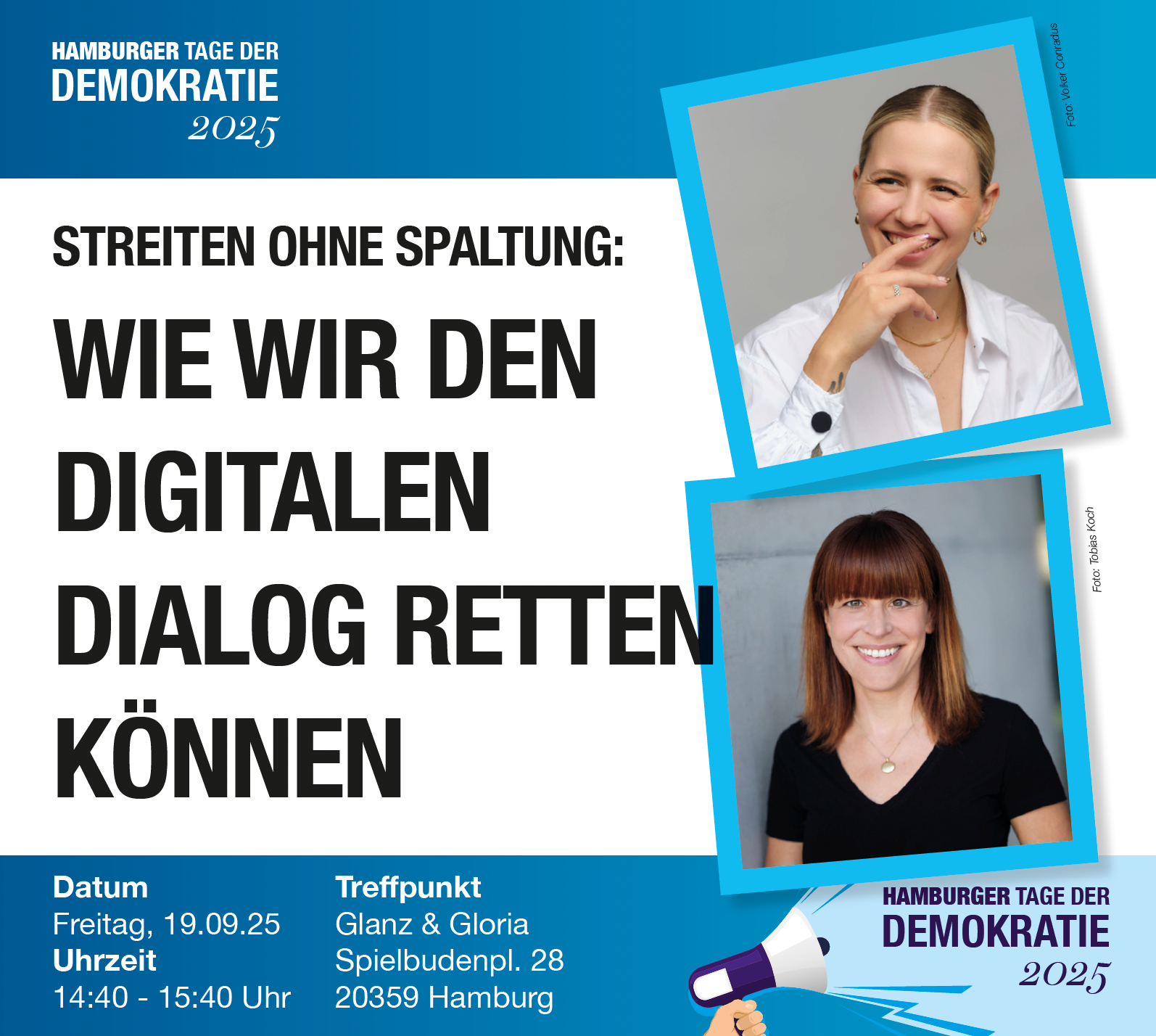 Den Abschluss der Hamburger Tage der Demokrate bildet am 19. September (14.40 - 15.40 Uhr im Glanz & Gloria) eine gemeinsame Veranstaltung aller Mitstreiter:innen in Kooperation mit der re:publica Hamburg auf dem Reeperbahnfestival 2025. Nach dem Motto "Streiten ohne Spaltung" stellen sich die Autorin und Politikwissenschaftlerin Julia Reuschenbach und Elina Eickstädt, Sprecherin des Chaos Computer Clubs, u.a. die Frage nach der Rolle sozialer Medien im öffentlichen Diskurs und wie wir den digitalen Dialog retten können. Ihr seid herzlich eingeladen, mit zu diskutieren. Eine Anmeldung ist nicht erforderlich. Die Veranstaltung ist kostenfrei. Hier gibt es weitere Infos zur Veranstaltung und zum Gesamtprogramm.